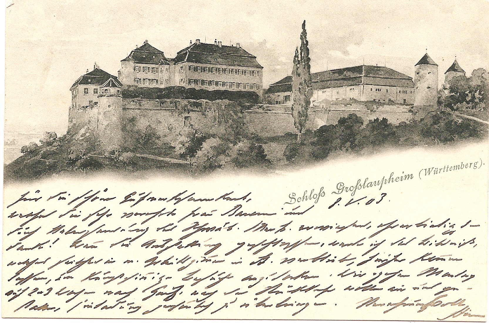 Sieben Türme gehören zum Schloss Großlaupheim (von links nach rechts):- das in die Mauer integrierte „Salzbüchsle“