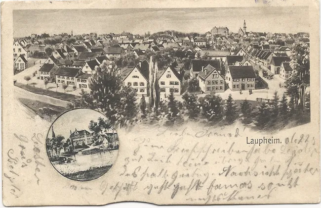 Bei dieser sehr seltenen Lithografie handelt es sich um eine sog. Revolverkarte. Auf der Bildseite ist links eine runde Öffnung ausgeschnitten. Durch Drehen einer Scheibe im Innern der Doppelkarte (rechter und linker Rand sind fest verklebt) erscheinen in dem runden Fenster 5 kleine Lithos mit Laupheimer Motiven: