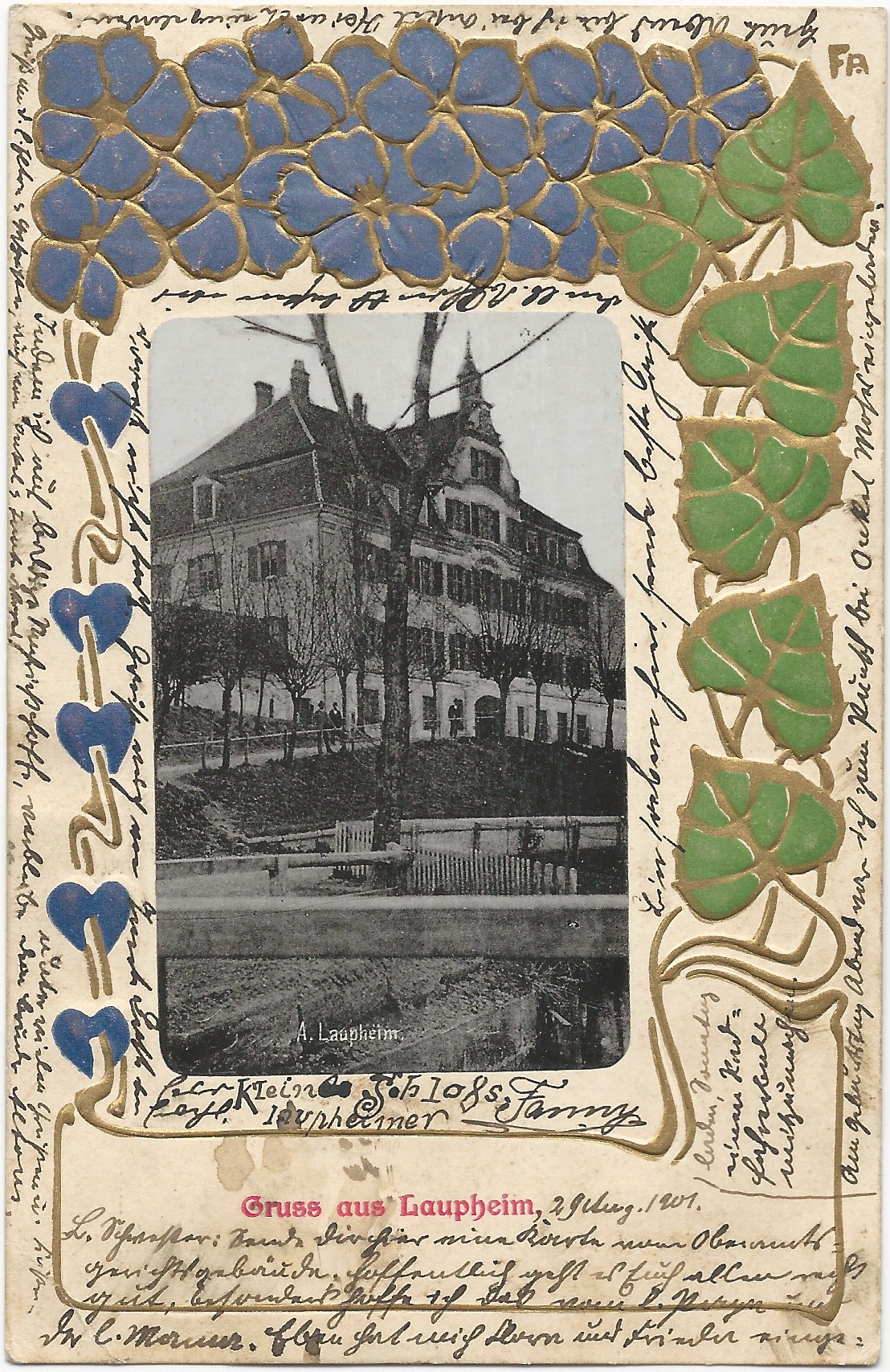 Diese Jugendstil-Prägekarte, nicht in Laupheim hergestellt, sondern in der Kunstanstalt Lautz u. Isenbeck in Darmstadt, stellt eine Besonderheit dar. Sie war um einiges teurer als normale Ansichtskarten und zeigt, dass der Absender gegenüber dem Empfänger schon rein äußerlich seine Wertschätzung ausdrücken möchte.