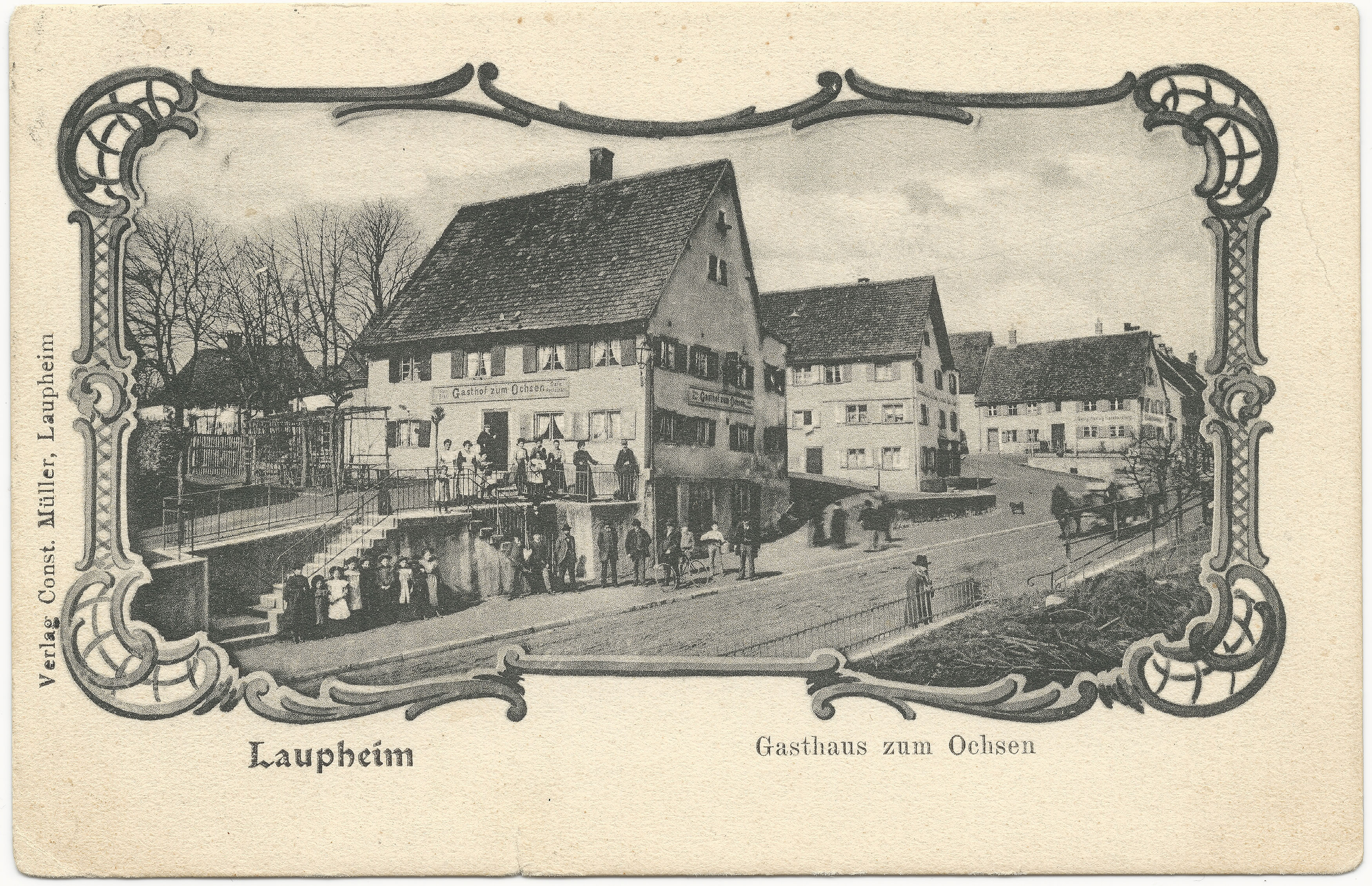 Der Laupheimer Fotograf Constantin Miller wählte als Standpunkt die höher liegende Straße direkt vor dem Judenberg gegenüber dem Gasthaus zum Ochsen. Viele Personen haben sich vor dem Gebäude aufgestellt, vermutlich jüdische Mitbürger, denn der Ochsen war die Wirtschaft der Laupheimer Judengemeinde.
