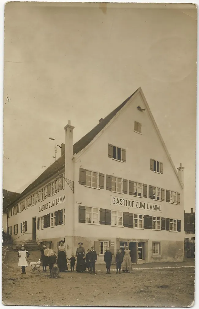 Der Gasthof zum Lamm war eine der ältesten Wirtschaften Laupheims. Im "Sonntagsstaat" haben sich drei Frauen und neun Kinder für den Fotografen vor dem stattlichen Gebäude aufgestellt.