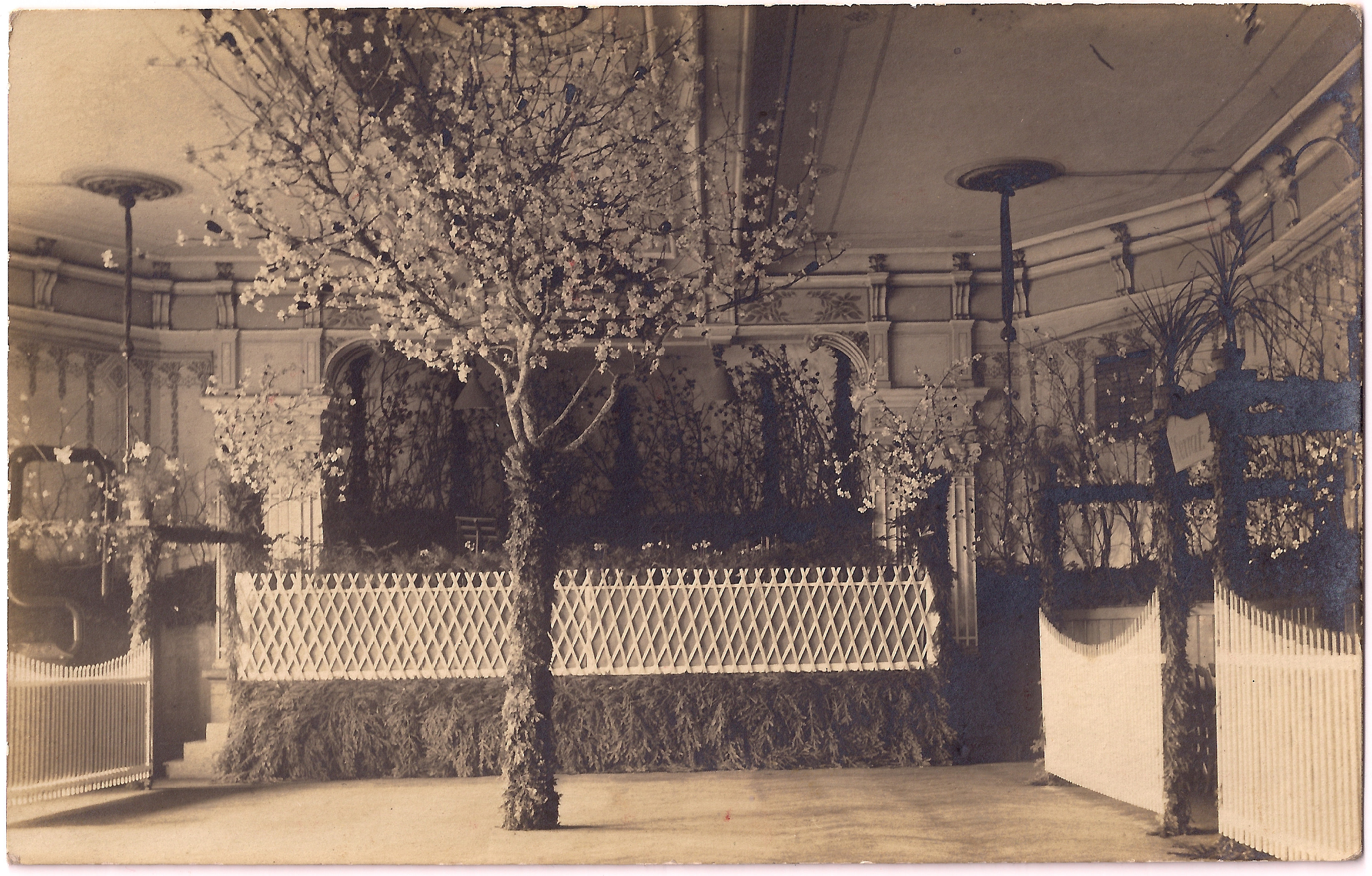 Diese Foto-Ak aus dem jahr 1925 zeigt den Saal des Gasthof zur Krone am oberen Marktplatz. Hier hatte der Verschönerungsverein Laupheim (gegründet 1879) die Dekoration für sein Frühlingsfest aufgebaut. Laut Auskunft von Theo Miller, Laupheim hielt der Verschönerungsverein viele seiner Veranstaltungen im Kronensaal ab. Der Kronensaal war in meiner Jugend neben dem Rabensaal der zweite große Veranstaltungsraum in Laupheim (mit einer eigenen Theaterbühne). Da er etwas kleiner als der Rabensaal war, eignete er sich besser für Familienfeiern. Ende der Sechziger wurde der Kronensaal Teil des Kaufhauses Osswald (später: Schlecker-Markt;heute: Harry\\\'s Sport Shop). Übrigens, im Kronensaal fand 1954 meine Schulentlassfeier statt (\\\"Oberschule\\\" Laupheim).