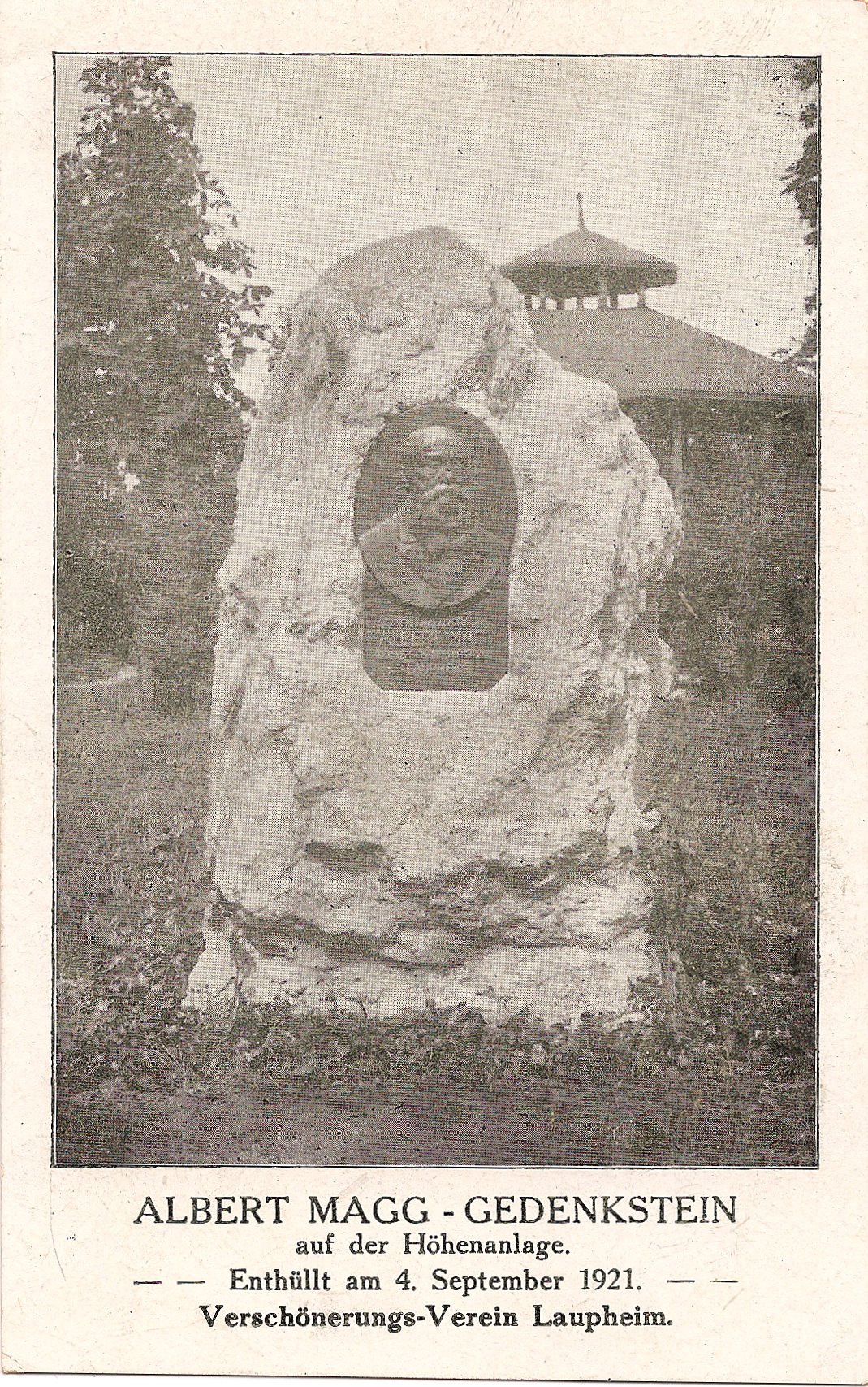 Wenn man von der Albert-Magg-Straße die Höhenanlage betritt, dann trifft man auf den Gedenkstein des Initiators dieses wunderschönen Parks. Auf der Bronzetafel steht:“ Seinem Ehrenvorstand Albert Magg / Der Verschönerunsverein Laupheim 1921“.