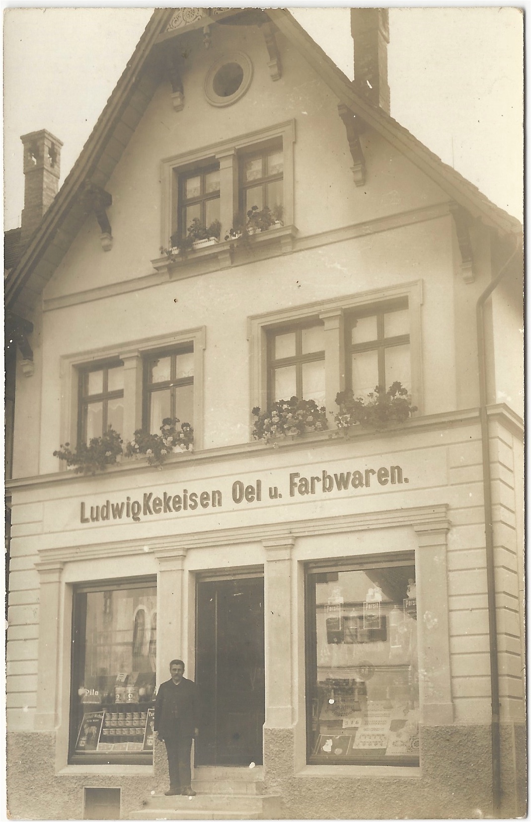 Dieses schöne Haus stand einst am Marktplatz schräg gegenüber dem alten Rathaus (Spital). Wo früher "Öl und Farbwaren" von Ludwig Kekeisen verkauft wurden (vermutlich steht der stolze Besitzer vor dem Eingang), wurde in den 80er Jahren ein Neubau errichtet, in dem sich heute das Reisebüro Flöter befindet.