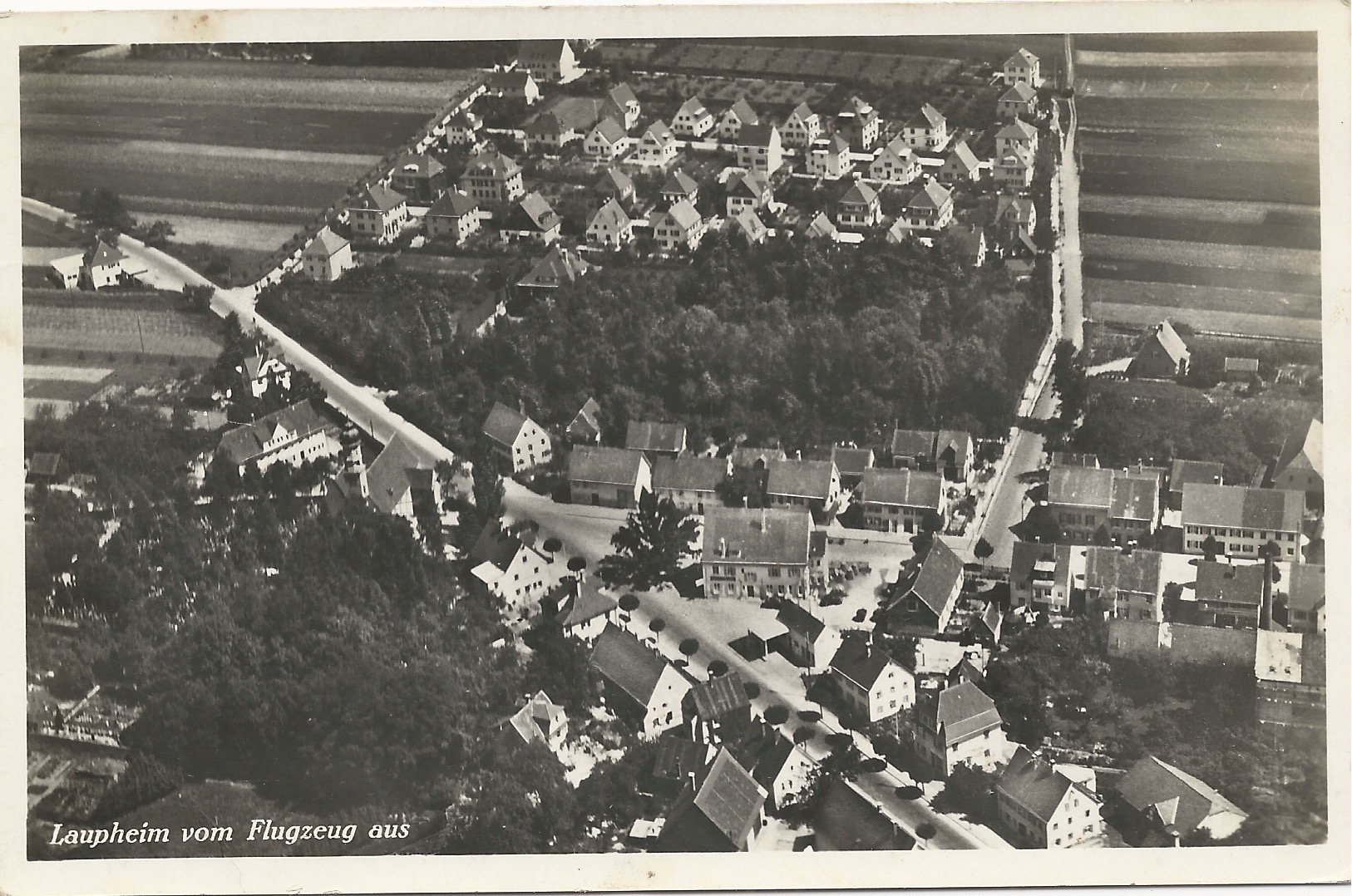 Diese Luftaufnahme zeigt größtenteils den sog. Laupheimer "Kapellenzipfel". Darunter verstand man früher das Gebiet rund um die Friedhofskapelle, deren Bewohner ihrer Sonntagspflicht in der Kapelle und nicht in der Stadtpfarrkirche nachkamen.