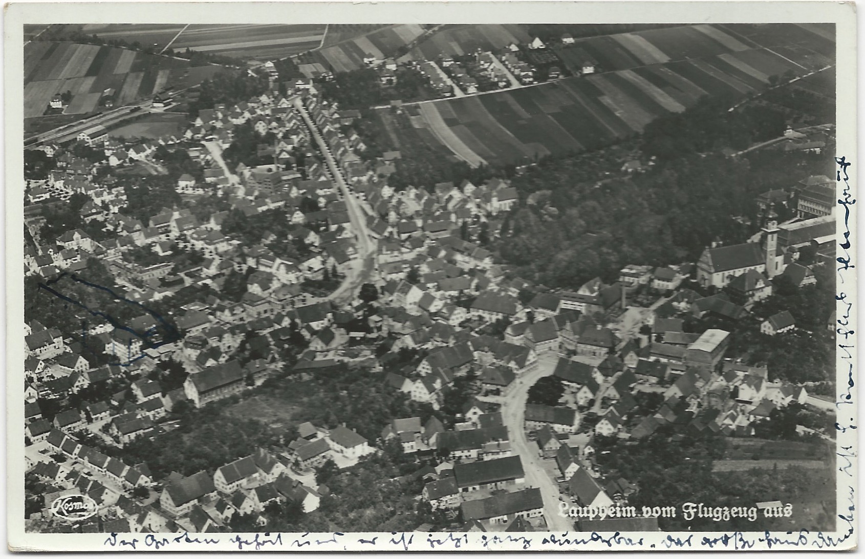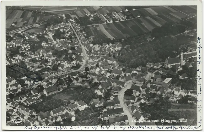 Die Luftaufnahmen von "Luftverkehr Strähle" bestechen durch Präzision. Vom Marktplatz im Zentrum des Bildes führt die Kapellenstraße nach oben bis zur Leonhardskapelle. Die nach rechts abbiegende Anna-von-Freyberg-Straße endet kurz nach der Einmündung der Ellerbachstraße in einen ungeteerten Feldweg. Gut zu erkennen ist auch die Villa Bergmann (später: Villa Mohn / Musikschule) mit Park.