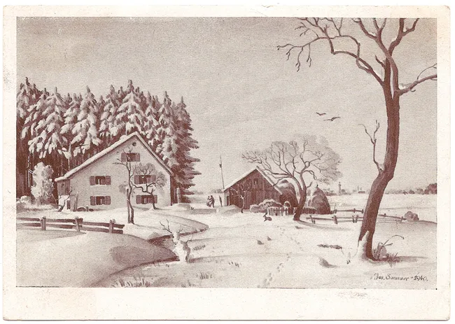 Der Laupheimer Malermeister Josef Sommer malte 1940 zu Gunsten des WHW dieses Motiv: Das Anwesen „Waldbaste“ am Bastelwald beim Heeresflugplatz. Das Haus wurde im April 1945 bei einem alliierten Luftangriff auf den Fliegerhorst völlig zerstört.