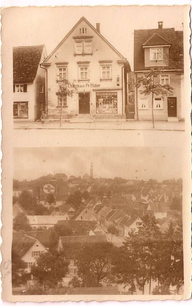 Im oberen Teil dieser zweiteiligen Ansichtskarte ist das "Uhrenhaus Fr. Huber" in der Mittelstraße 23 zu sehen. Das Haus steht noch heute und ist durch Renovierungen äußerlich nur unwesentlich verändert worden. Heute hat die Firma "Hörsysteme Bendel" hier ihr Geschäft. Das schmale (leerstehende)Gebäude auf der rechten Seite sieht heute noch so aus wie vor über 70 Jahren. Das Lebensmittelgeschäft von Max Hänle musste dem imposanten Neubau der Sparkasse weichen. April 2013