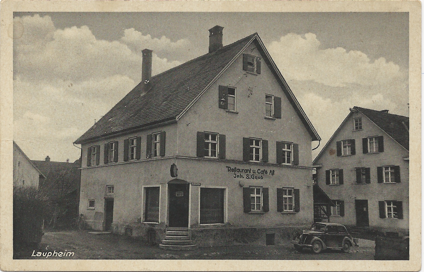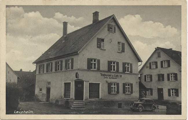 Wir blicken von der Schmiedstraße auf das "Restaurant und Café zum Ast / Inh. S. Gaub". Links führt die Aststraße in Richtung Mittelstraße. Im Hintergrund erkennen wie noch einen Teil des Bauernhofes Ganser. Rechts neben dem Café steht das Haus Obstbaum (Kürschnerei).