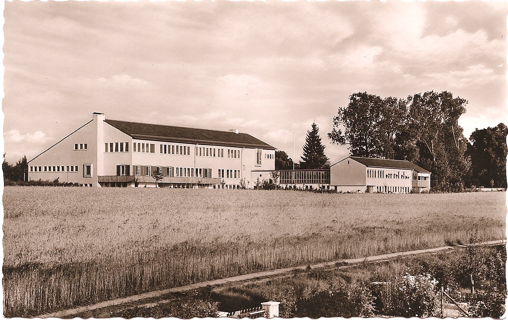 Nach dem Auszug der Landwirtschaftsschüler zogen Grundschüler ein. Sibylle, Christina und Dominik gingen dort zur Schule. Mit Beginn des Schuljahres 1993/94 war der benachbarte Neubau der Grundschule Bronner Berg fertig. Im Zuge der Neugestaltung der Außenanlagen riss man die auf der Postkarte rechts abgebildeten Teile ab. Auch den Verbindungsgang zwischen den beiden Gebäuden gibt es nicht mehr, ebenso den Balkon am Hauptgebäude. Damit wurde die Chance vertan, ein typisches Bauwerk aus den frühen Fünfzigern als Baudenkmal im Ganzen zu erhalten.
