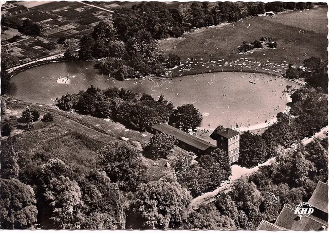 Die Wasserfläche hat die Form einer Acht (heute darf nur noch im vorderen, größeren Teil geschwommen werden). In der Mitte des kleineren Teiles war ein Springbrunnen. Ganz links erkennt man eine Kleingartensiedlung. Dort steht heute die Herrenmahd-Halle.