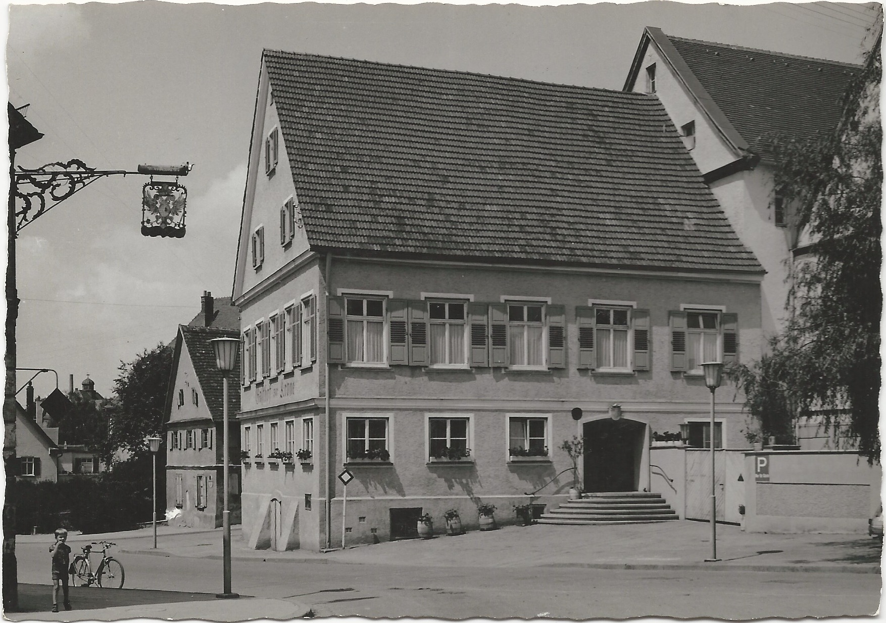 Rechts überagt das Ökonomiegebäude der Krone die Brauereigaststätte (im Erdgeschoss befand sich der Kuhstall, und hinter dem Tor neben dem Eingang zur Witschaft war eine große Miste).