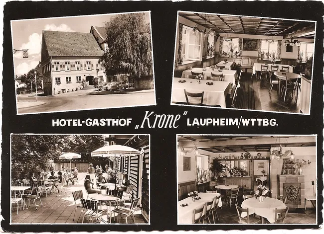 Zu den ganz alten Wirtschaften in Laupheim gehört die Krone. Sie wird schon 1710 erwähnt. Auch die Krone hatte einen Saal, in dem z.B. meine Schulentlassung stattgefunden hat.