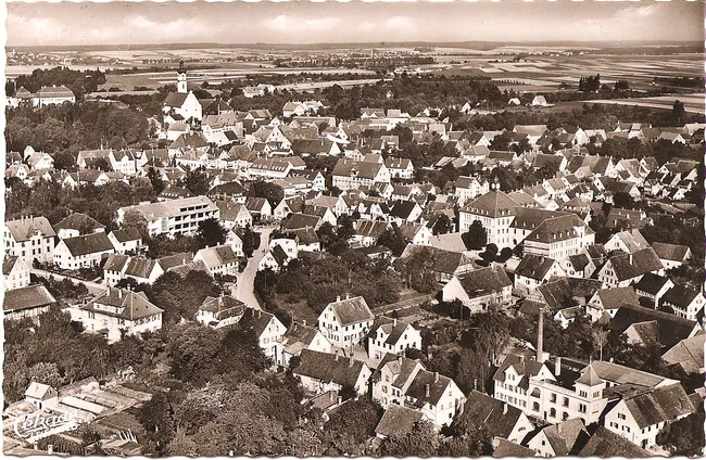 • am unteren rechten Bildrand die Gebäude der Firma Kekeisen; zu erkennen am viereckigen Türmchen und am Kamin (heue: Firma in der Erwin-Rentschler-Straße)
