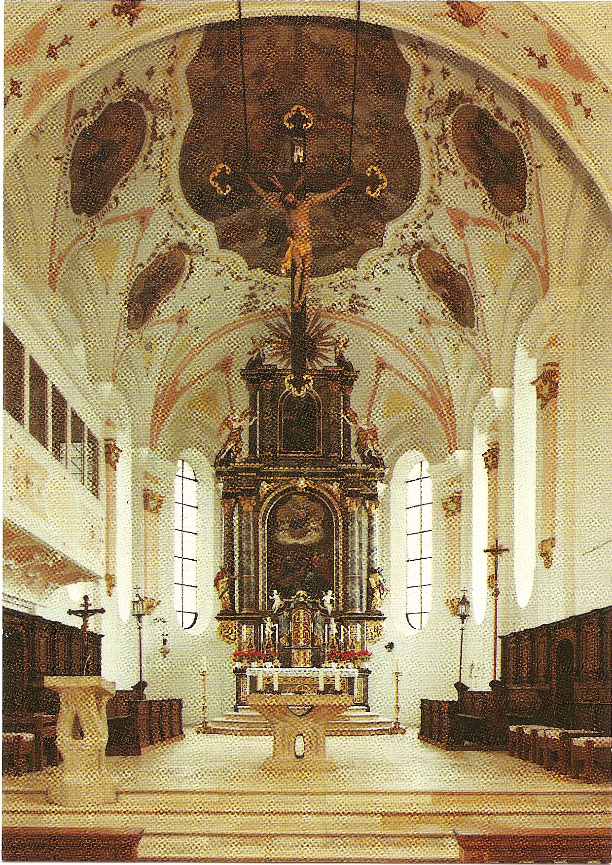 In den neunziger Jahren ersetzte der künstlerisch gestaltete Steinaltar den zunächst aufgestellten barocken Tisch. Auch das große Kreuz bekam wieder seinen Platz im Chorbogen, den es bereits um die Jahrhundertwende innehatte (vgl. PP 3). Das 1956 ausgewechselte Hochaltarbild (Christi Himmelfahrt) kehrte an seine alte Stelle zurück.