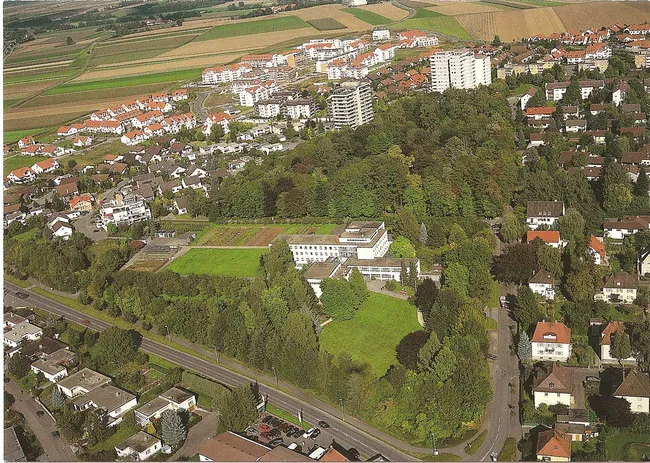 Mehr als 30 Jahre später zeigt diese Luftaufnahme von 1997 ein anderes Bild des Dreifaltigkeitsklosters. Das Gelände ist inzwischen von hohen Büschen und Bäumen umgeben. Hinter dem Kloster dehnt sich die Siedlung „Bronner Berg Nord“ aus.